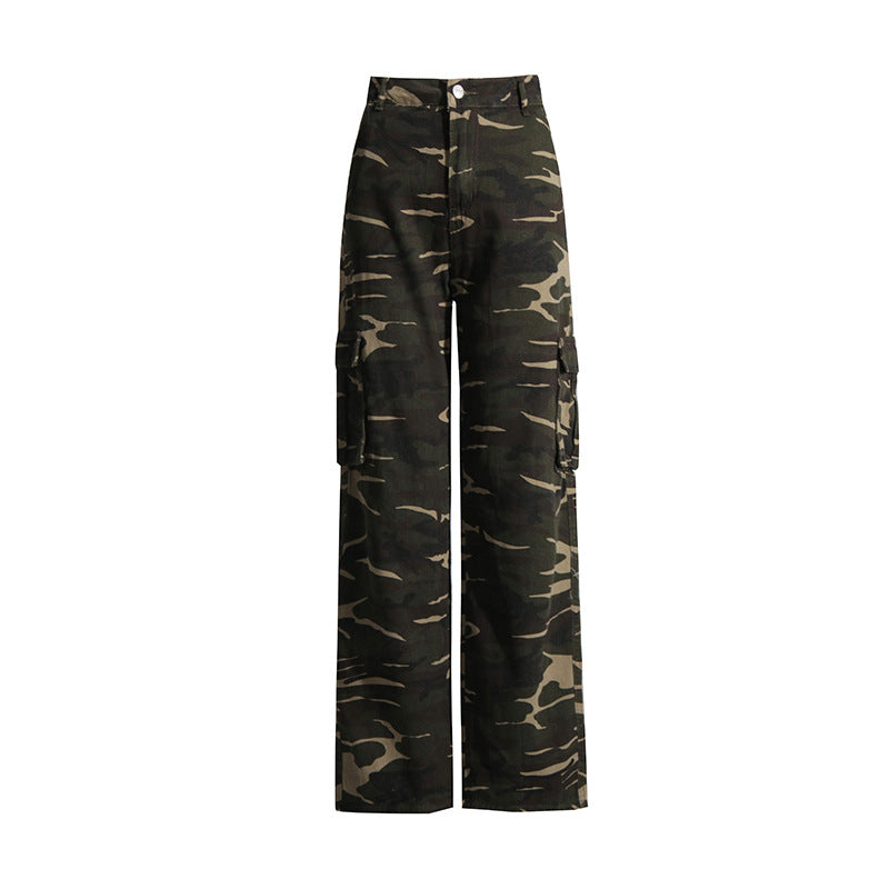 High Street Retro Denim Camouflage Pants Autumn Trendy Multi Pocket Workwear Straight Leg Pants Women