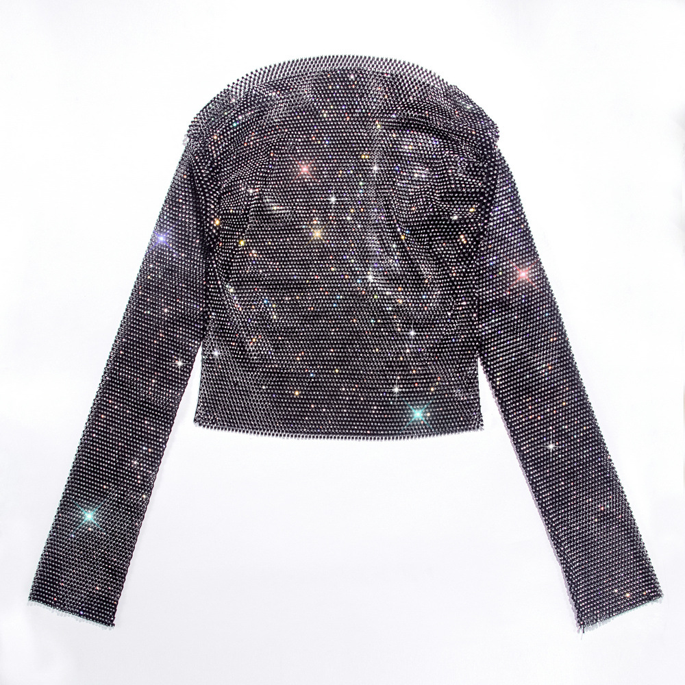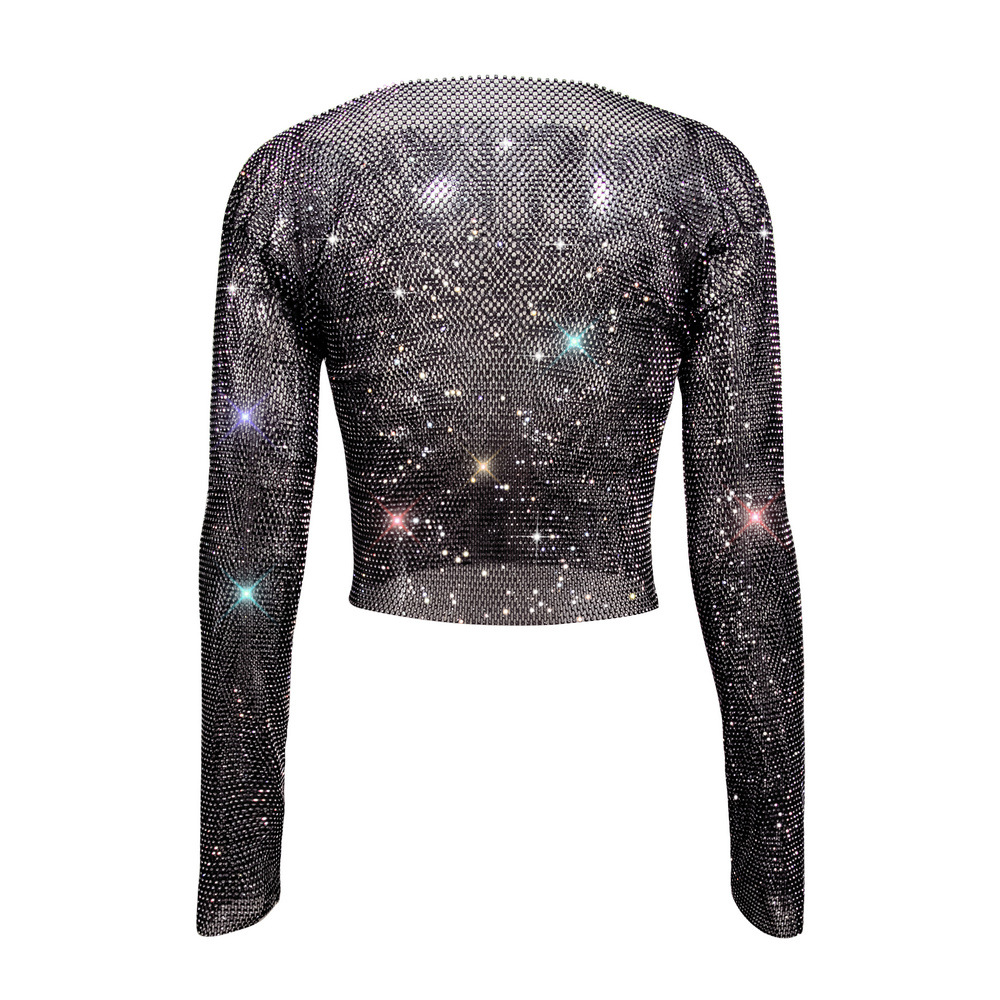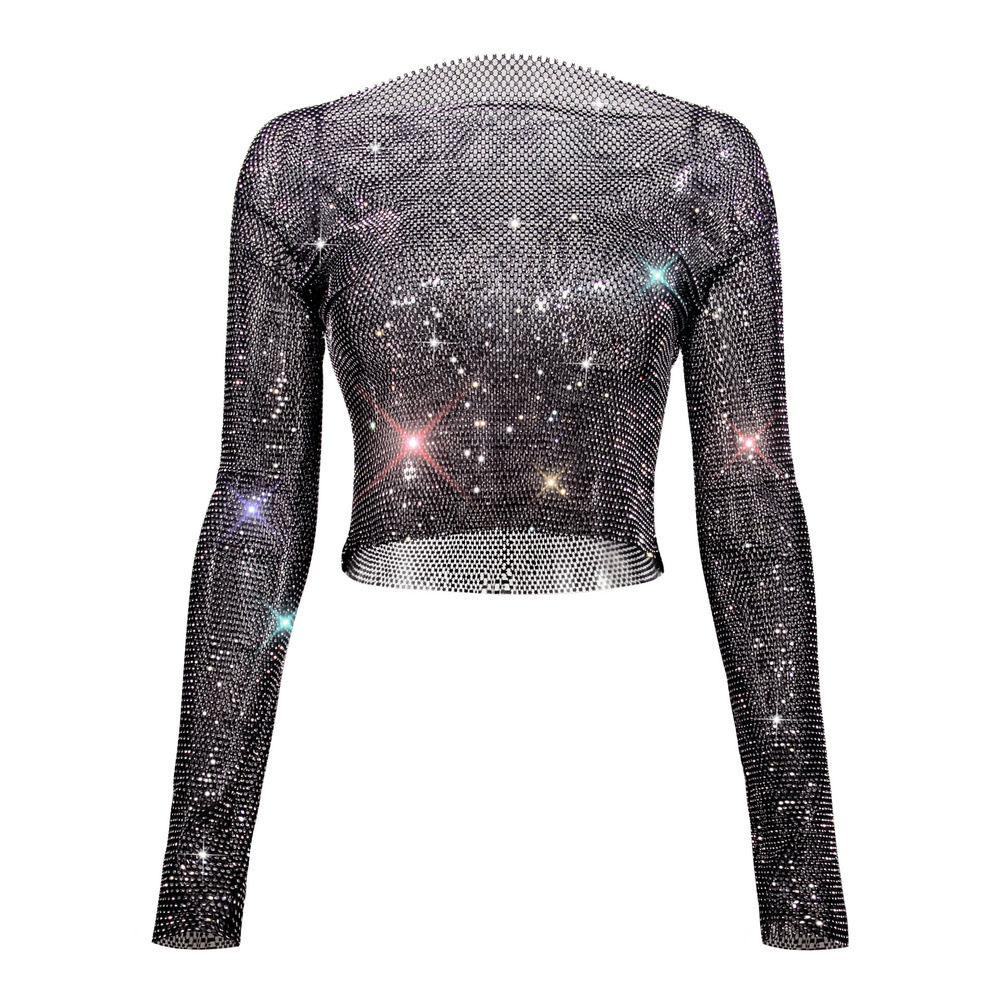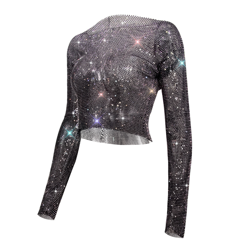 Rhinestone T shirt Women Clothing Popular Mesh Rhinestone Disco Long Sleeved Top