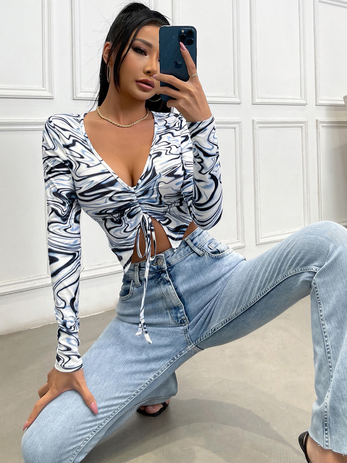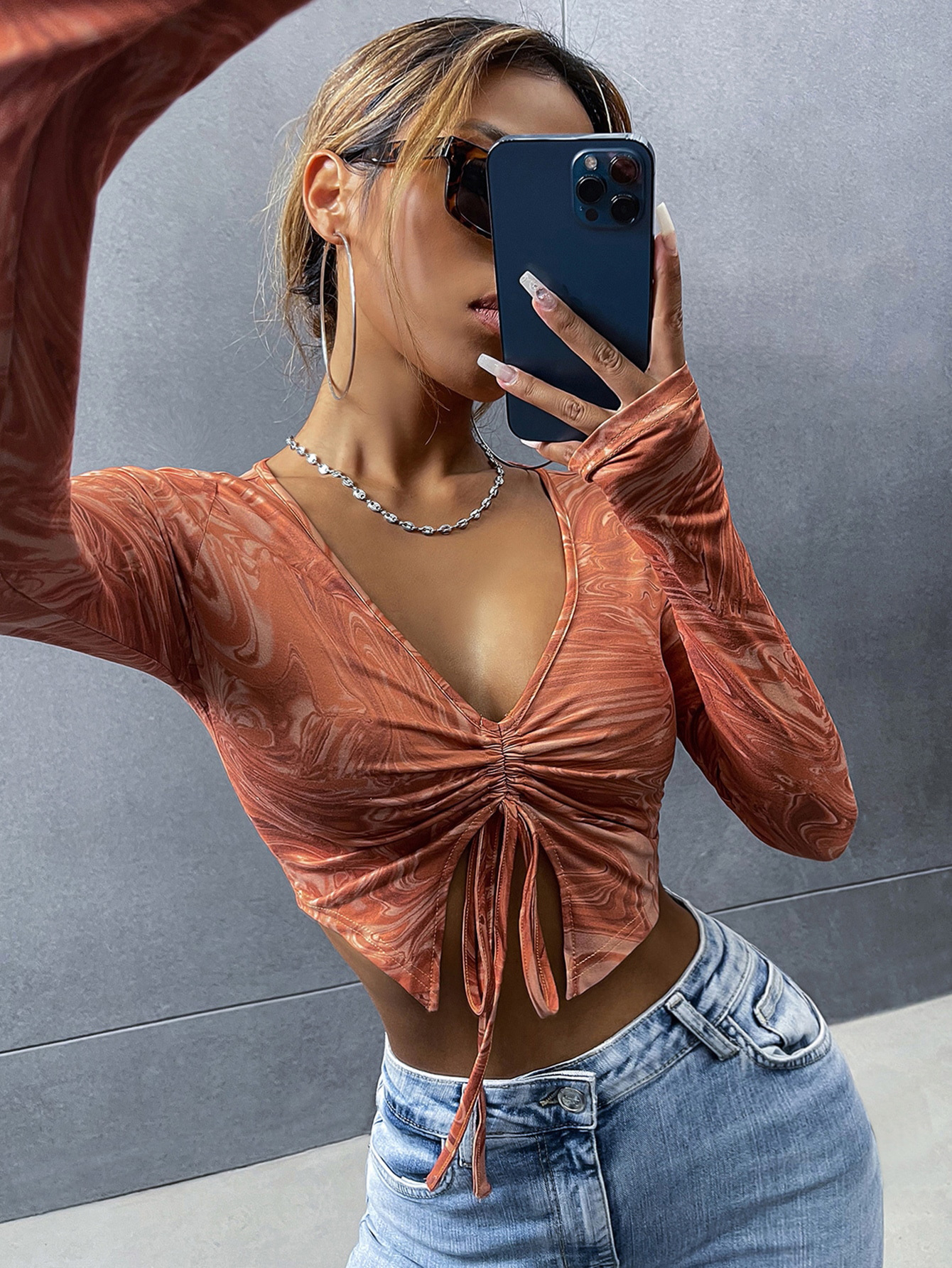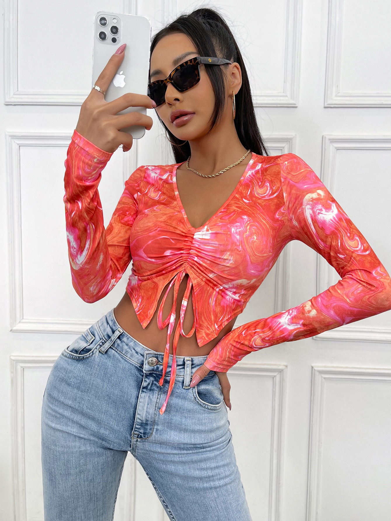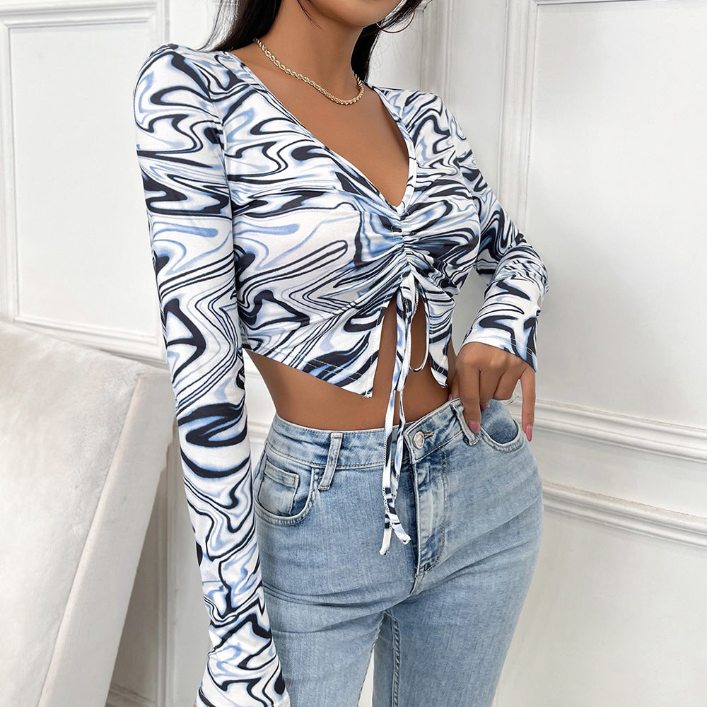 Women V neck Long Sleeve Drawstring Slim Fit Cropped Top Breathable Pleated Solid Color Simple Sweet T shirt Women Casual Spring Autumn Top